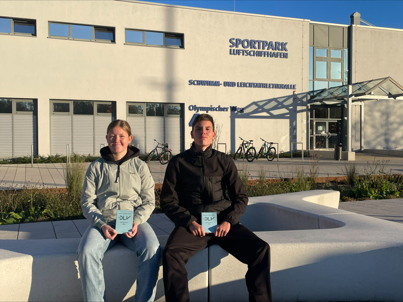 Foto: Helene und Marcel vor der Leichtathletikhalle im Sportpark am Luftschiffhafen Potsdam. Voller Stolz halten sie ihre Kampfrichterausweise.